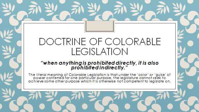 The doctrine of colorable legislation is a legal principle that aims to prevent excessive and unconstitutional use of the legislative authority of the government. The doctrine is derived from the Latin maxim “quando aliquid prohibetur ex directo, prohibetur et per obliquum, “ meaning things that cannot be done directly should not be done indirectly. This means that when a legislature does not have the power to make laws on a particular subject directly, it cannot make laws on it indirectly. Colourable legislation is one of the doctrines under the Indian Constitution. It means colored legislation, which is not its actual color. So, whenever the Union or state encroaches on their respective legislative competence and makes such laws, colourable legislation comes into the picture to determine legislative accountability of that law. The Black’s Law Dictionary defines the word ‘colourable’ as: